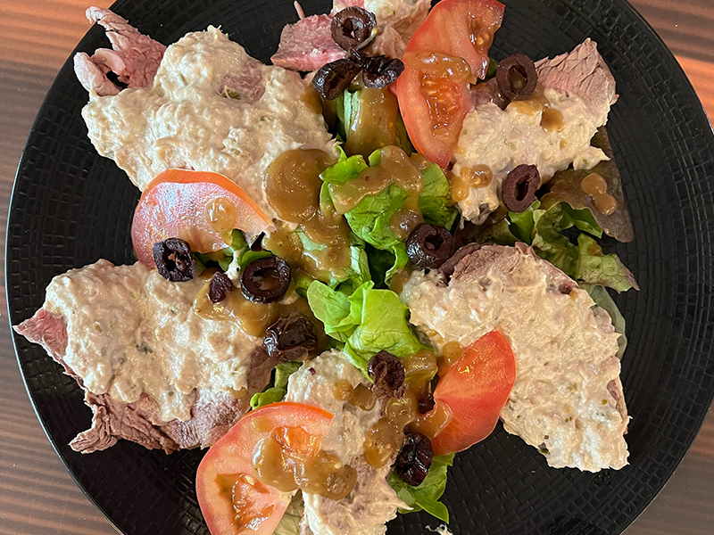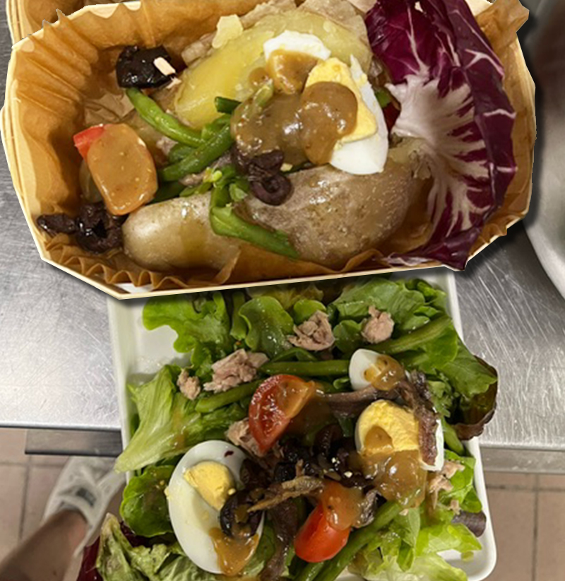 FAÇON SALADE NIÇOISE 19 € : Pomme de terre chaude garnie de thon, tomates, haricots verts, anchois, œuf, olives de Nyons et salade verte