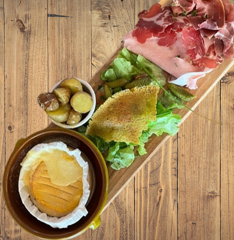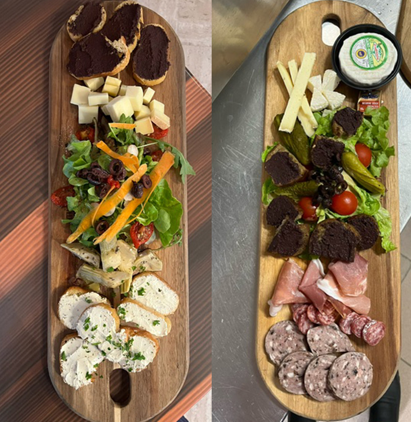 LA BARONNIES 18 € : 3 fromages, 3 charcuteries, toasts de tapenade de Nyons, olives cornichons, beurre